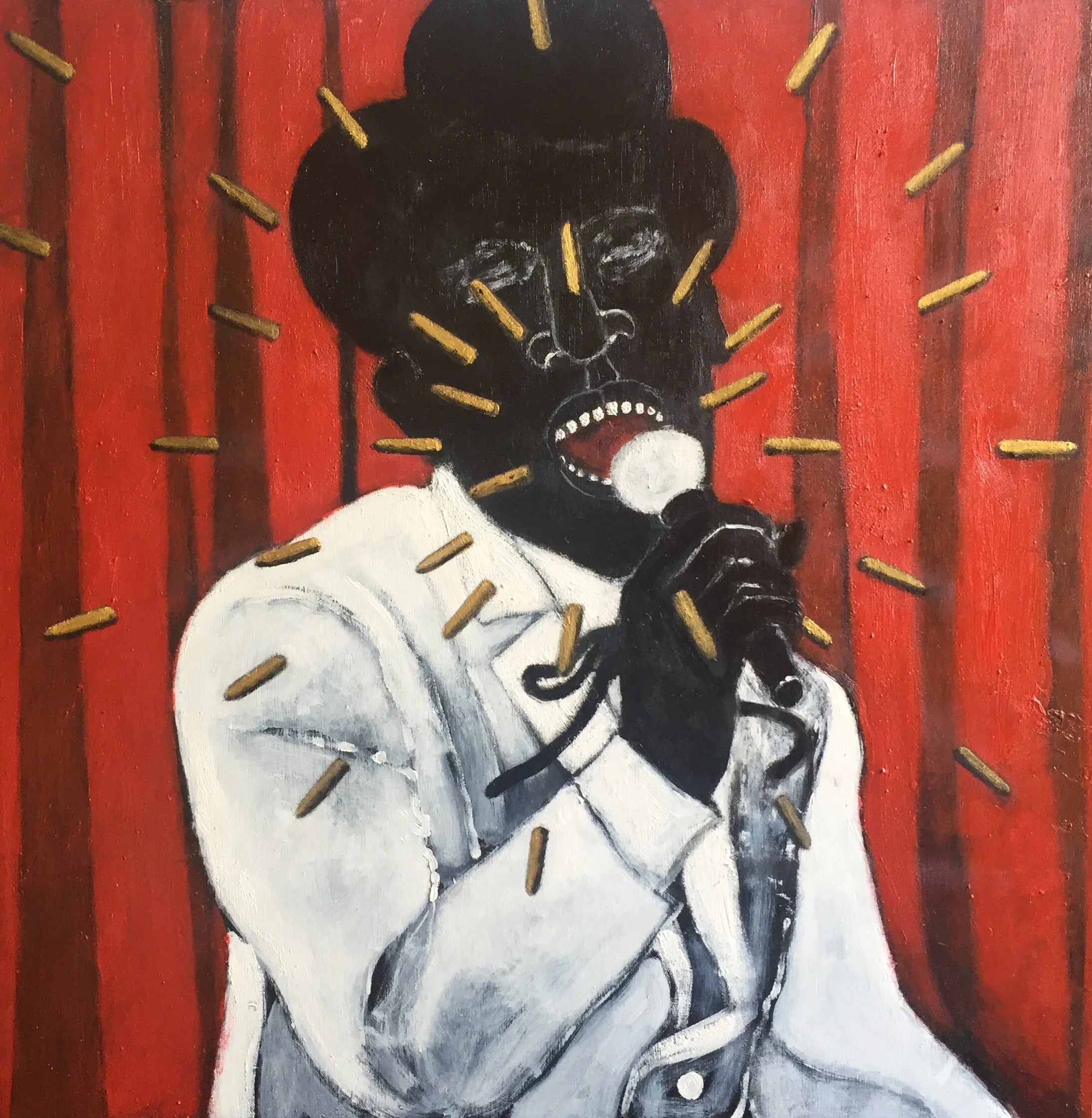 The figurative subjects are distilled to their essential forms in a bold and stylised manner. The paintings which often incorporate descriptive titles or other text explore personal and universal themes expressed to create a vivid and intense world. It is a world of sharp contrasts populated by Orishas, Saints, and farm animals as well as a cast of fictional character such as Captain Nice, Amazing Grace, Area Boy, Bloody Mary, Mary of Hull, Prince Charming, Joy Rider, Best Boy, Lucky Derek, Angel of the South, Can do Noah and many more.